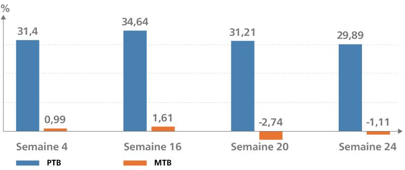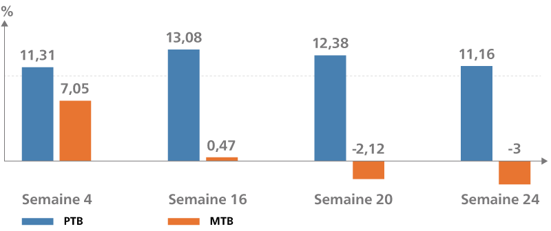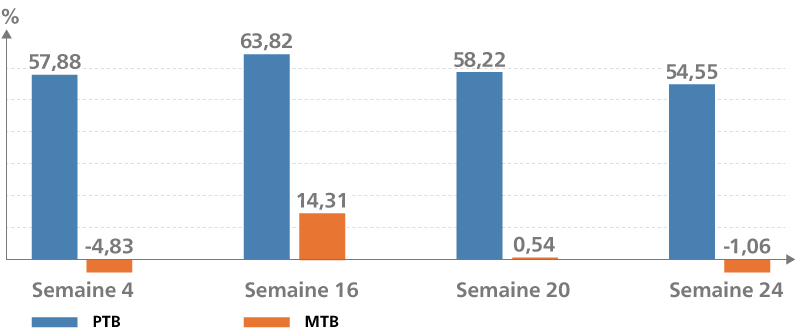 Fig. 01 : à 24 semaines, le pourcentage de réduction par rapport au début de l’étude était de 54,55 % (2,53 %) pour le groupe PTB et de −1,06 % (2,52 %) pour le groupe MTB.