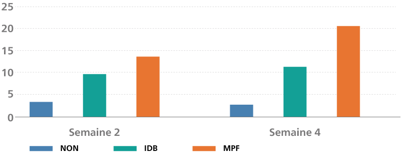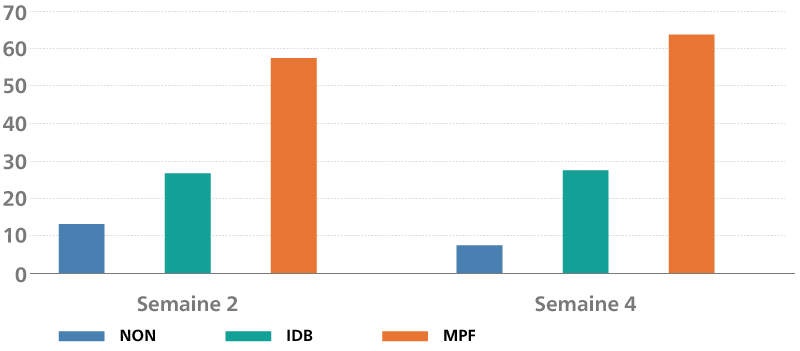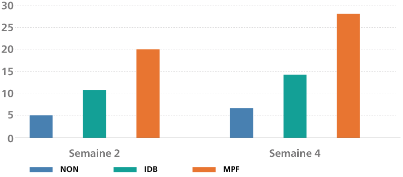 MPF = brosse à dents manuelle avec Philips Sonicare Power Flosser équipé de l’embout Quad Stream. b : Les comparaisons par paire étaient statistiquement significatives par rapport aux groupes NON et IDB.