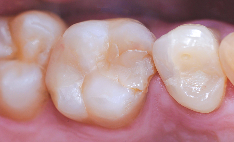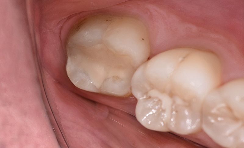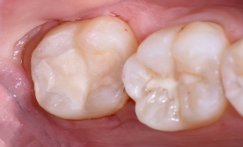 Fig. 08 : restauration de classe II en verre hybride de la dent 26 au moyen d’EQUIA Forte (GC), juste après le traitement.