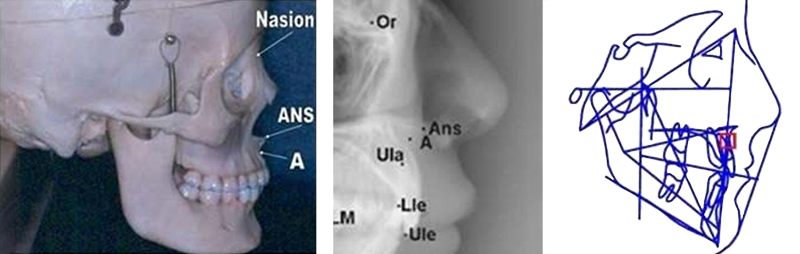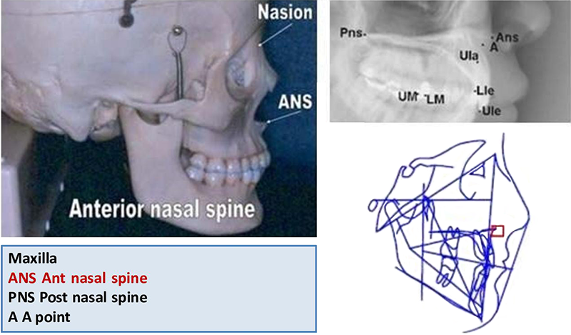 • ANS (aussi nommé ENA pour point Epine Nasale Antérieure) : indique le point le plus antérieur du prémaxillaire.