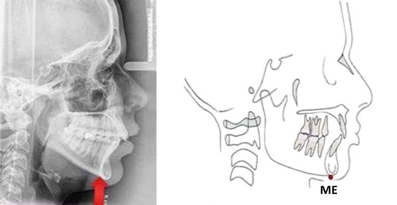 • Me (qui signifie Menton) : indique le point le plus inférieur de l’image de la symphyse mentonnière.