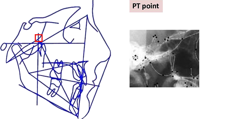 • Pt (qui signifie Point ptérygoïdien) : indique le point d’entrée du canal grand rond dans l’arrière-fond de la fosse ptérygo-maxillaire ou le point à mi-chemin entre le point le plus supérieur et le point le plus postérieur de l’image de la fente ptérygo-maxillaire.