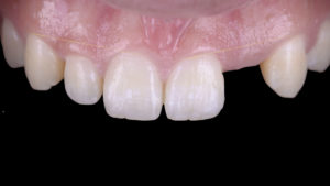 L’intégration esthétique est très intéressante à condition de remodeler la gencive en amont. L’hygiène sous l’inter de bridge est assurée simplement par le passage d’un fil dentaire entre 22 et 23 et l’incisive remplacée évolue avec sa dent support.