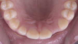 L’analyse esthétique montre une légère asymétrie de largeur entre les espaces de 12 et de 22, or il est important dans le secteur antérieur de respecter la symétrie de proportion la plus parfaite entre deux incisives. Il est aussi à noter dès ce stade que la 12 présente un diastème mésial et une proportion réduite par rapport aux deux incisives centrales contre-indiquant la fermeture de celui-ci. Il est donc demandé à l’orthodontiste d’améliorer cette symétrie avant la dépose de l’appareil.