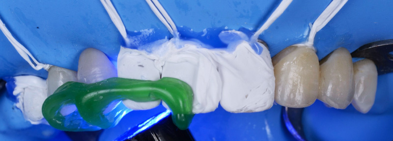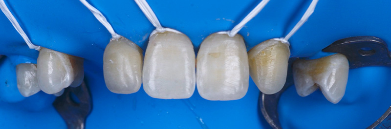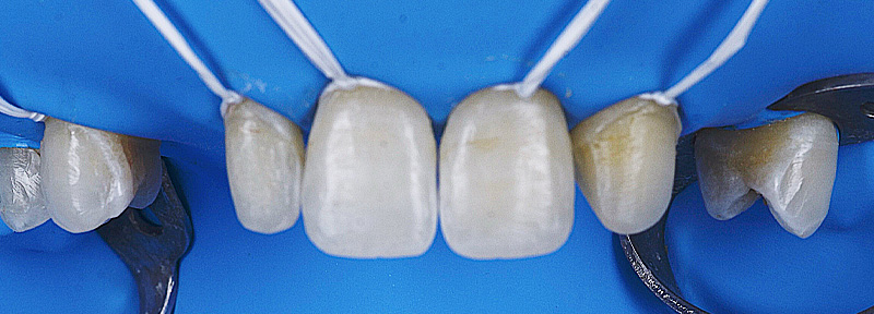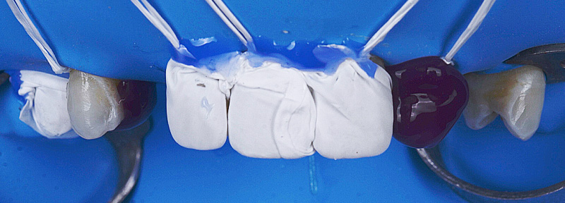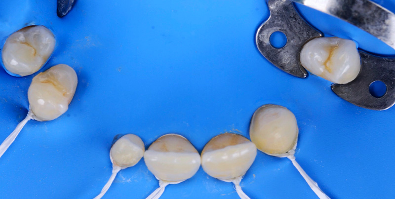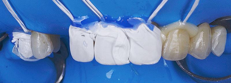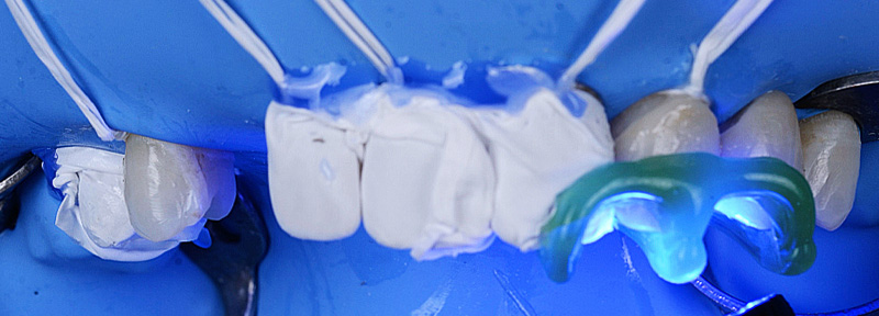 Fig. 11 : procédure de collage des bridges cantilevers en zircone stabilisés par des clés en résine de positionnement (Panavia™ V5, Kuraray).