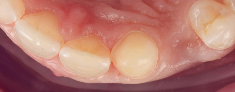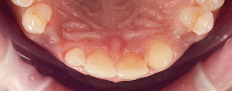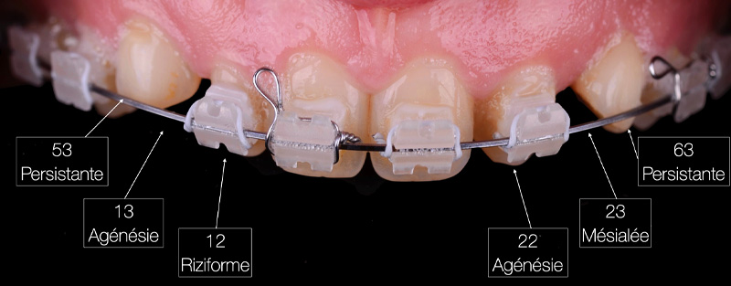 Après dépose de l’appareil, les dents de lait 53 et 63 sont extraites, la 12 riziforme est gonflée en composite et la 23 est modifiée par coronoplastie vestibulaire et composite incisal.