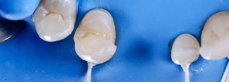 Fig. 06 : pièces prothétiques du laboratoire Dominique Watzki. Bridge cantilever en zircone 13/14, facette EMax 12 et bridge cantilever en zircone 22/23.