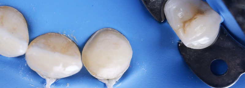 Une autre option aurait pu consister à prendre appui sur la 24 et à recouvrir la 23 d’une facette unitaire indépendante. Mais la possibilité de préserver l’émail sur la 23 (du fait d’une légère inocclusion) nous a poussé à préserver la 24 et à opter pour une couronne périphérique collée qui modifie la 23 en 22 et soutient la 23 absente.