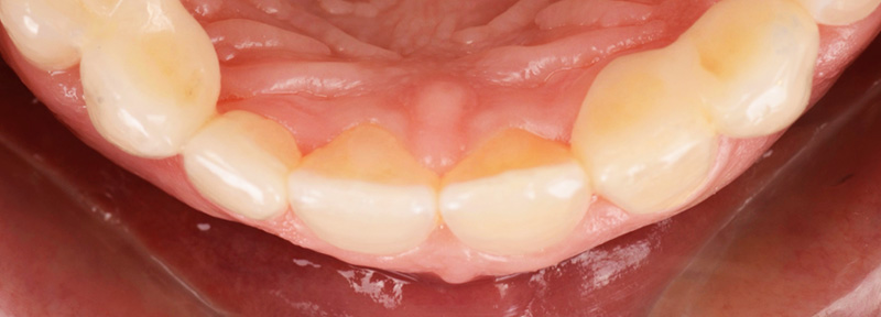 L’orthodontiste a réalisé une gouttière de contention avec deux dents en résine en remplacement des dents manquantes. L’intrado est rebasé avec du composite pour modeler le futur lit gingival des 2 inters de bridge en 10 jours.
