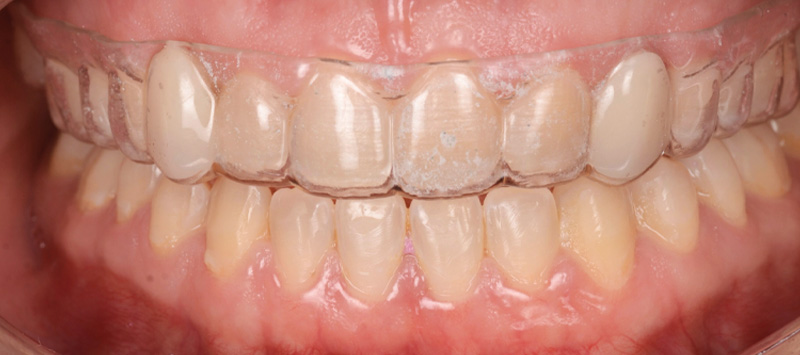 Un éclaircissement ambulatoire (Pola Night 10%, SDI) est réalisé pendant 3 semaines à l’aide des gouttières de contention à la demande de la patiente avant d’envisager la réhabilitation prothétique.