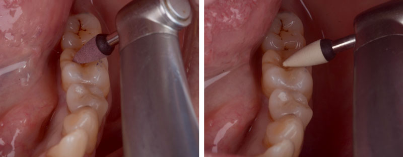 L’onlay collé est alors testé et réglé en occlusion puis les zones de retouches et le joint sont polis à l’aide d’un kit de polissoirs à céramique (Haeggen – AB Dental).
