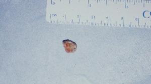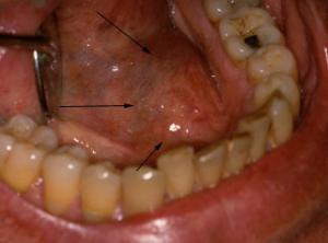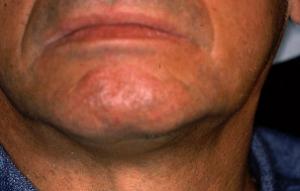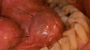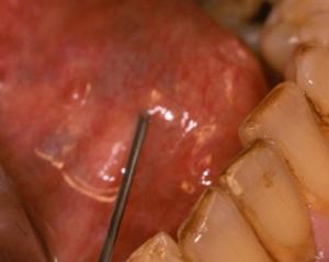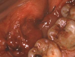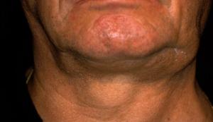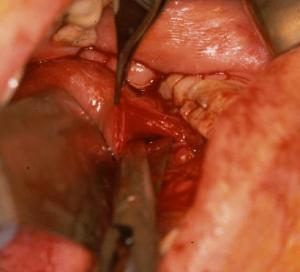 Marsupialisation d’un volumineux kyste mucoïde. Homme de 62 ans présentant une volumineuse tuméfaction sous maxillaire gauche de la taille d’un abricot « écrasé » fluctuante, non adhérente, non douloureuse à la palpation.