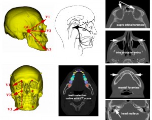 Les 16 repères anatomiques, qui sont actuellement sélectionnés pour la création du modèle, correspondent aux deux foramen supra orbitaires V1, aux deux foramen infra orbitaires, grand ronds et grand palatins ainsi qu’aux foramen naso-palatin supérieur et inférieur V2, aux deux foramen mentonniers et mandibulaires V3, et à la tête des deux marteaux. Le marteau qui par son origine, le premier arc, et par l’innervation du muscle de son manche, le muscle tenseur du tympan, V3, appartient au système trigéminal. Des repères trigéminaux complémentaires, identifiables sur les coupes TDM natives, les impressions trigéminales (empreintes des ganglions de Gasser sur les crêtes pétreuses), les foramen ovales…sont susceptibles d’être utilisés et l’ont été par certains d’entre nous notamment en anthropologie pour l’étude de l’évolution de la base du crâne