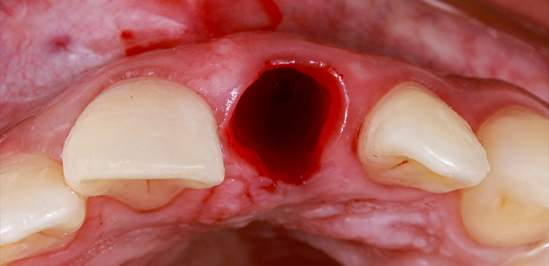 L’extraction atraumatique a été réalisée sur l’incisive 21, en essayant de préserver l’intégrité des gencives, des papilles et de l’architecture gingivale autant que possible.