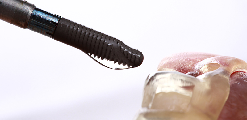 Fig. 14 : après la superposition de la zone cervicale, le pilier hybride est dévissé pour un polissage extra-oral. Ici, vous voyez le revissage avec un couple de 25 Ncm.