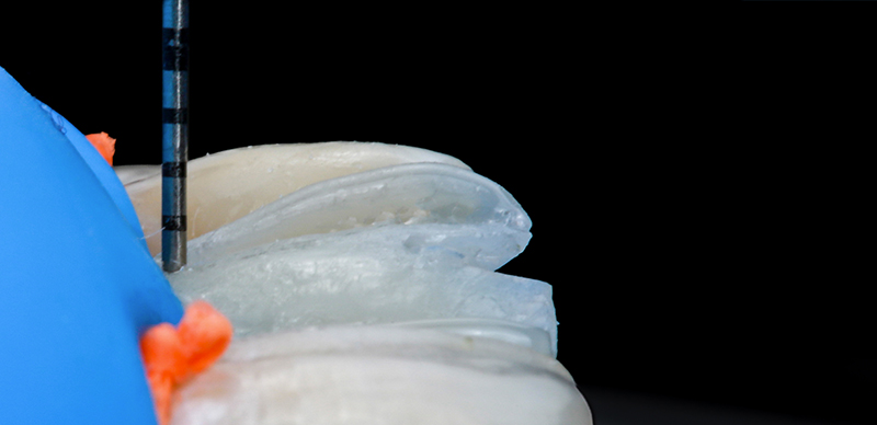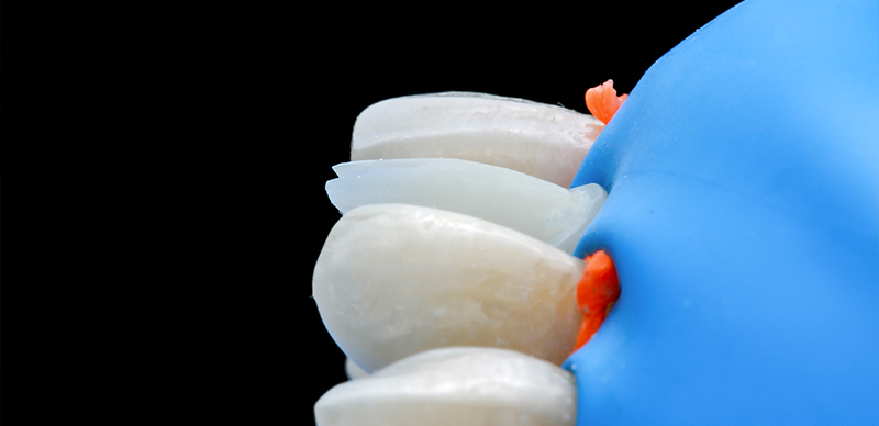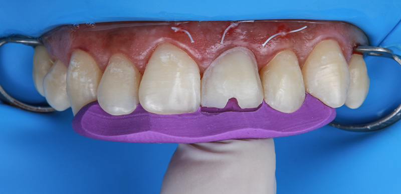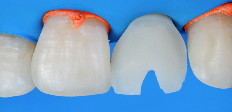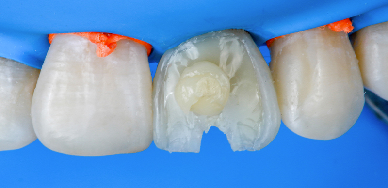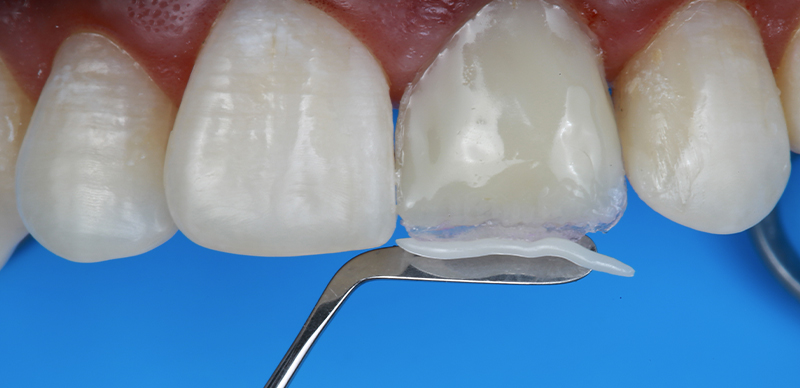 Après fixation dans sa position finale, une facette composite directe (Admira Fusion, VOCO) a été superposée à la sous-structure CAD/CAM sous digue. La superposition a d’abord été réalisée au niveau cervical.