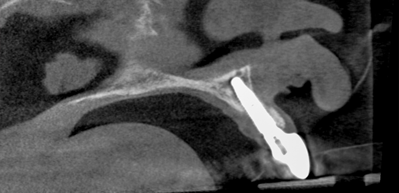 La tomographie postopératoire a confirmé le bon positionnement et l’ajustement des composants de l’implant. On peut voir ici que l’utilisation d’un pilier concave a créé un espace pour les matériaux de greffe et a assuré une épaisseur tissulaire à long terme.