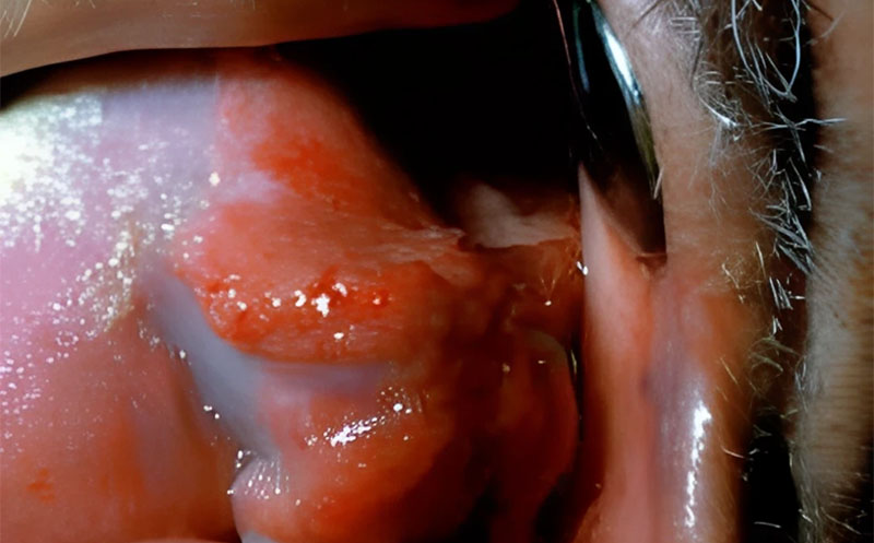 • Forme ulcérée en « feuillets de livre ». Importance de bien déplier les muqueuses lors de l’examen et d’écarter la langue.