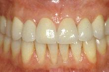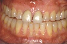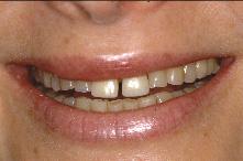 Madame G. esthéticienne a la trentaine ; très attachée à son image et particulièrement à son sourire, elle a une demande précise concernant la teinte et la forme de ses dents ; elle souhaite voir aussi disparaître les liserés cervicaux, l’opacité et le diasthème entre ses deux incisives centrales.