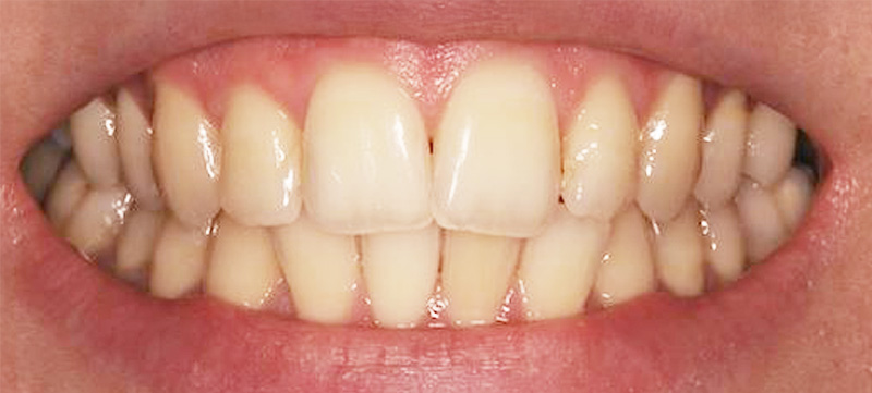 Fig. 01 : présentation clinique d’une classe II en parodontie, avec un Smile Esthetic Index (SEI) de 7/10. Le sourire est symétrique, le parodonte mandibulaire est exposé, et une dyschromie est observée sur la 31.