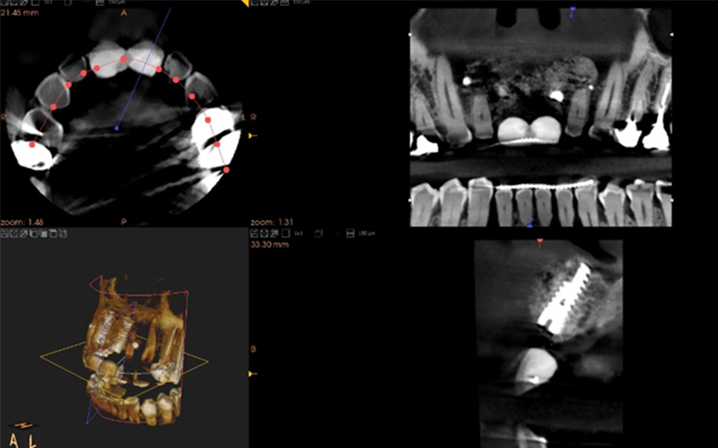 Un cone beam est réalisé pour évaluer les volumes osseux. Celui-ci met en évidence la perte osseuse vestibulaire sur les incisives centrales avec une lésion apicale.