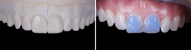 Nous avons donc proposé à notre patiente 2 facettes en céramique E.max® Press (Ivoclar), choisie pour ses atouts mécaniques et esthétiques, pour son potentiel de collage, pour le parfait ajustage que procure la technique de céramique pressée et pour la réponse parodontale excellente que le « tout-céramique » nous offre.
