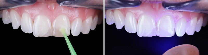 Après validation de l’essayage esthétique, la séance se poursuit par le collage des 2 facettes à l’aide d’un adhésif universel, G-Premio BOND (GC), et d’une résine fluide très hautement chargée, G-ænial Universel Injectable (GC).