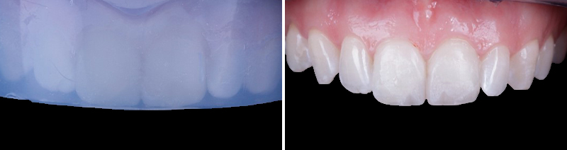 Facettes provisoiresFacettes provisoiresFig. 04 : les facettes provisoires sont réalisées et scellées temporairement à l’aide d’une résine translucide Sealtemp clear (Elsodent).