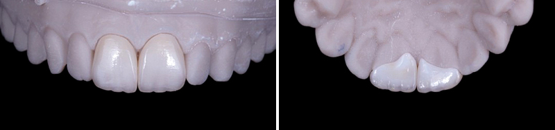 Du point de vue esthétique, la situation est favorable, car l’épaisseur de la céramique dans la zone du bord libre permet au céramiste de recréer des effets optiques impossibles à réaliser pour des facettes très fines. Les préparations vestibulaires doivent, en revanche, être réduites à leur plus simple expression afin de favoriser le collage sur l’émail et de minimiser l’altération des tissus dentaires.