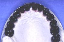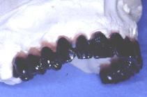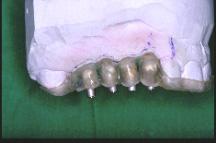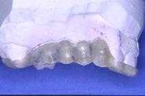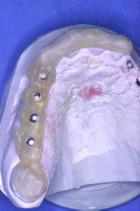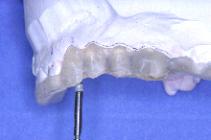 Un forage est réalisé au milieu de la face occlusale de 13 sur le bridge résine : à partir de cet axe de référence, le aboratoire va effectuer un forage au niveau de chacune des dents suivants en les parallélisant. L’autre côté est organisé de la même façon.