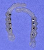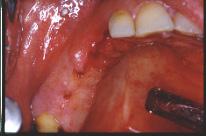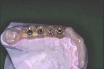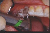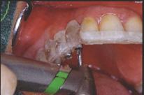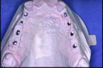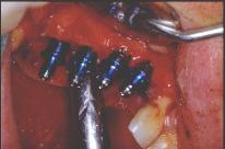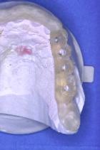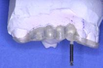 Mise en place du guide sur la gencive : la stabilisation se fait tout à fait naturellement sur les cales avant et postérieures. Les tubes qui ne sont pas solidaires de la résine mais coulissants sont poussés fermement au contact de la gencive. La première fraise-boule de marquage est passée successivement dans chaque tube et ne traverse la corticale que de 2 à 3 mm.