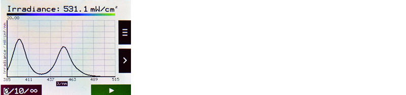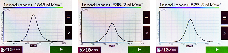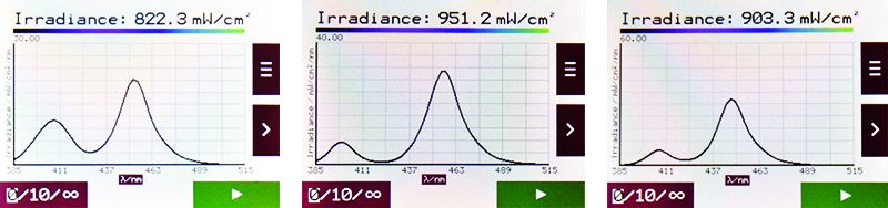 Lampe à photopolymériser, Puissance radiante, irradiance et spectre d’une même lampe selon les modesLampe à photopolymériser, Puissance radiante, irradiance et spectre d’une même lampe selon les modesLampe à photopolymériser, Puissance radiante, irradiance et spectre d’une même lampe selon les modesFig. 11 : puissance radiante, irradiance et spectre d’une même lampe selon les modes.