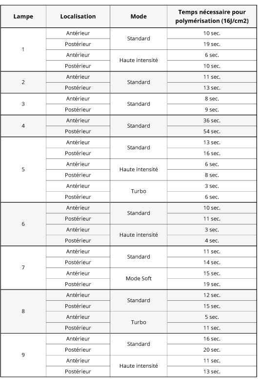 Si l’on prend un composite dont le temps de polymérisation recommandé par le fabricant est de 10 secondes à 800 mW/cm2, il faut délivrer une puissance de 8 J/cm2 pour obtenir une polymérisation complète ; pour un composite dont le temps est de 20 sec, il faudra 16 J/cm2.