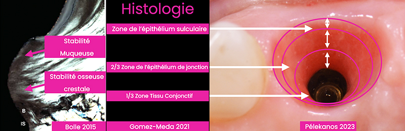 Sur cette coupe histologique autour d’un implant monobloc et d’un point de vue cliniquement corroboré, l’adhésion épithéliale et conjonctive formée dans cette concavité va assurer à la fois, la stabilité de l’os crestal du côté apical et la stabilité de la muqueuse plus coronairement.
