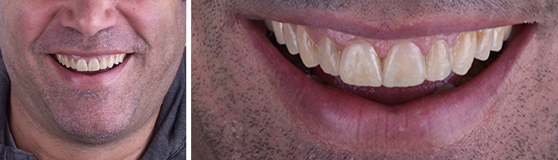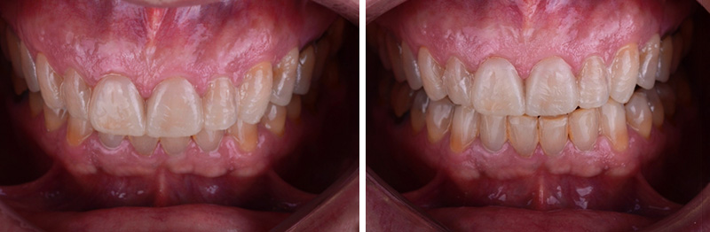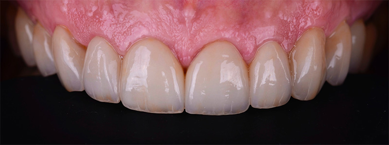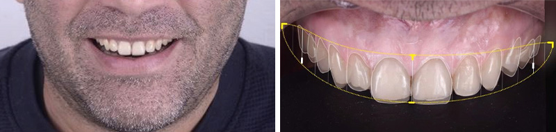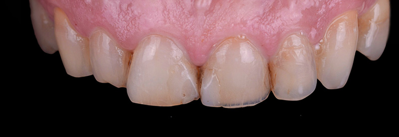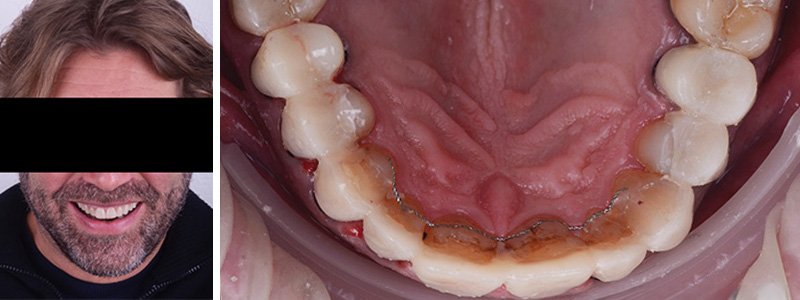 Ce patient de 50 ans se présente à la consultation pour des raisons esthétiques : il trouve que ses dents jaunissent (malgré un éclaircissement récent), que ses bords incisifs maxillaires s’effritent et que les limites cervicales de ses couronnes 15 et 25 sont trop visibles.