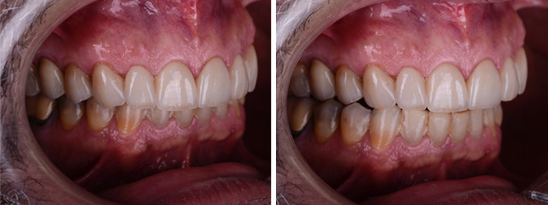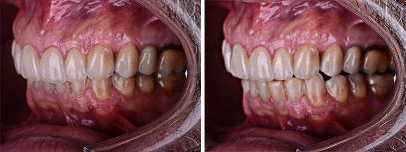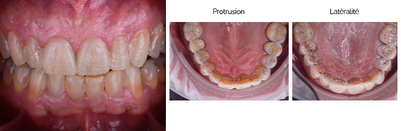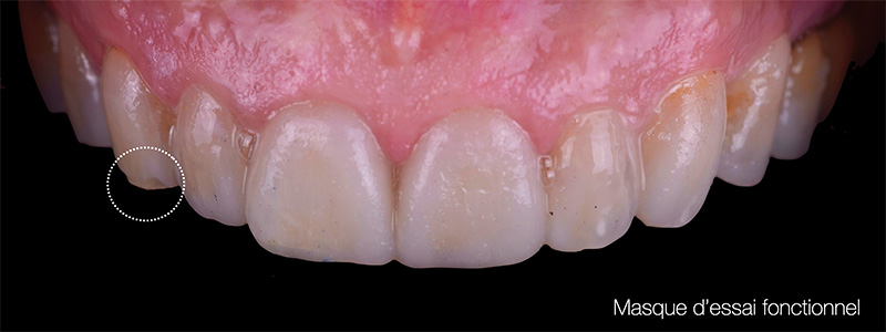 • Un essai fonctionnel pour tester et équilibrer l’Occlusion d’Intercuspidiation Maximale (OIM) statique et dynamique (propulsion et latéralité). Lors des réglages, nous notons d’ailleurs une fracture de la pointe canine de la 13 en latéralité mettant en évidence la nécessité de la raccourcir.
