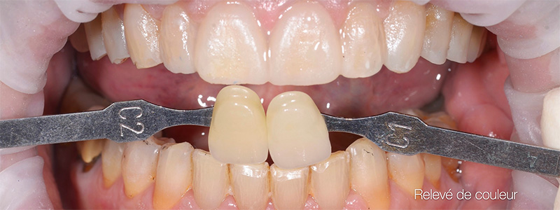 La fine épaisseur des facettes nécessite, en fin de séance, de transmettre au céramiste la couleur des dents supports grâce à un teintier dentine.