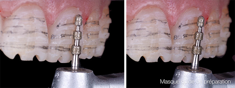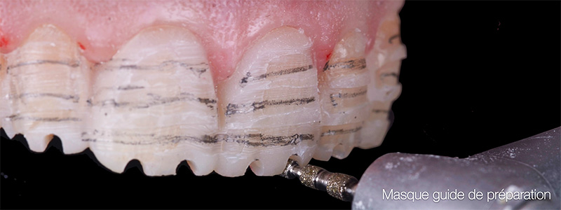 La préparation des facettes démarre par un rainurage du masque grâce à des fraises de pénétration contrôlée de 0,5 mm en vestibulaire et 1,5 mm en incisal, tout en veillant à respecter les axes de chaque dent. Le masque nous sert ainsi de guide de préparation.