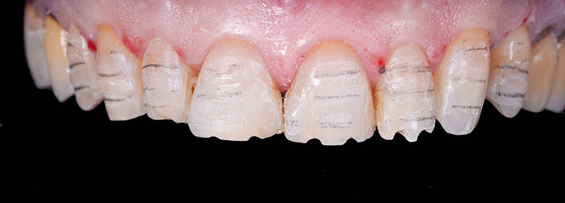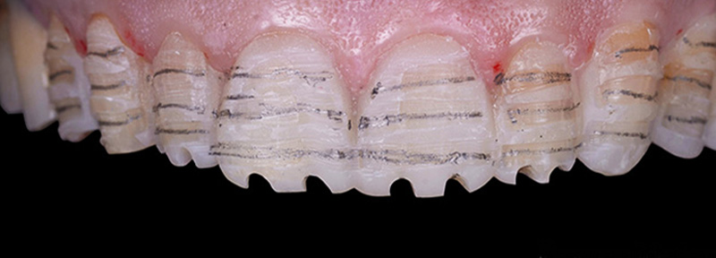La résine est alors déposée et les traits de crayon tracés au fond des rainures sont éliminés pour assurer une épaisseur minimale nécessaire de céramique tout en préservant au maximum l’émail résiduel.