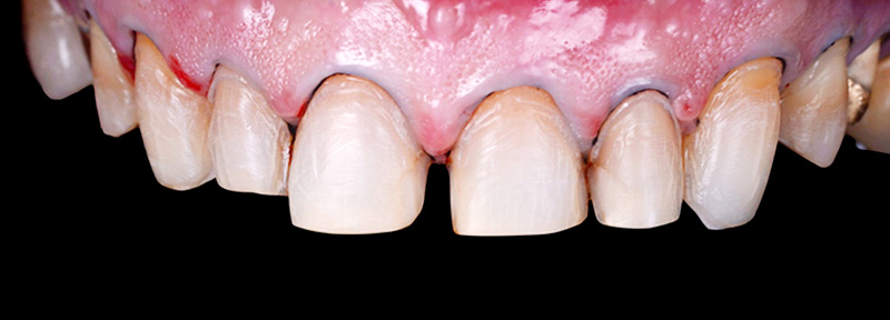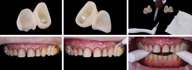 Dans un premier temps, les couronnes et veneelays provisoires sont moulés sur les prémolaires. Les pièces obtenues sont détourées et scellées avec un ciment résineux provisoire (Dentotemp, Itena).