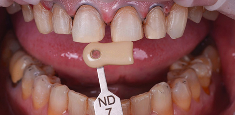 Il permettra ainsi de servir de guide de morphologie à notre céramiste. La couleur des dents à recopier est définie avant la préparation pour éviter une erreur liée à la déshydratation pendant la préparation.
