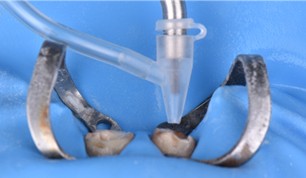 Fig. 11 : injection de STELA™ Automix dans le canal et sur le moignon et mise en place sans attendre des tenons sous pression.
