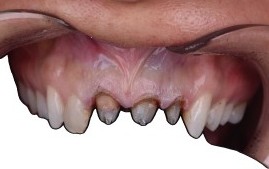 • Joints prothétiques visibles, infiltrations et caries secondaires proximales, profil d’émergence non physiologique, embrasures fermées, dyschromie marquée (couronnes réalisées en 2017).