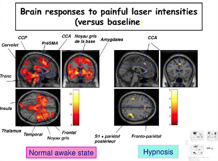 La douleur vue au pet scan à gauche … Le même patient avec la même douleur en état d’hypnose ( Travaux du Pr FAYMONVILLE)