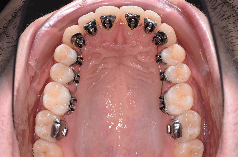 Fig. 02 : appareil orthodontique lingual totalement individualisé (WIN, DW Lingual Systems, Bad Essen, Allemagne) : les attaches et l’arc sont sur-mesure, ce qui permet à l’appareil d’épouser parfaitement la forme d’arcade.