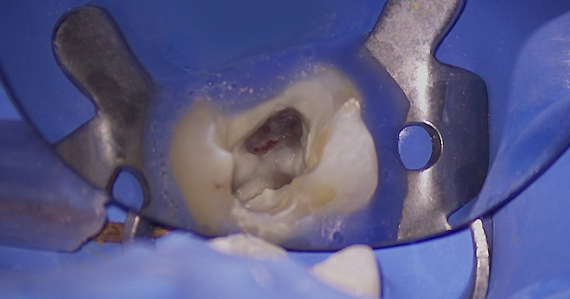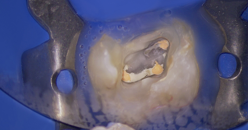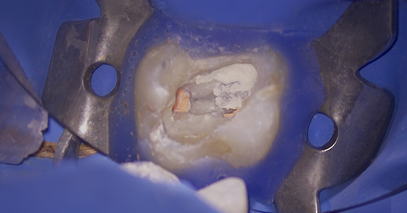 Après une anesthésie para-apicale, le champ opératoire est mis en place sur la dent. Le composite présent est entièrement déposé et le tissu carieux sous-jacent est éliminé.