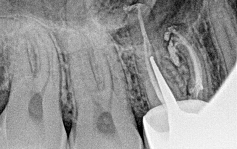Comme vous pouvez le voir, je n’ai pas seulement éliminé la contrainte qui empêchait ma lime de progresser dans le canal… À ce stade, je décide de poursuivre la séquence initialement prévue, tout en ajoutant l’étape de la gestion de cette perforation.