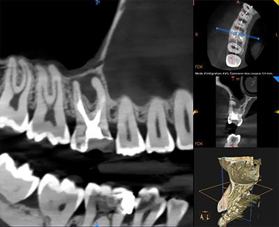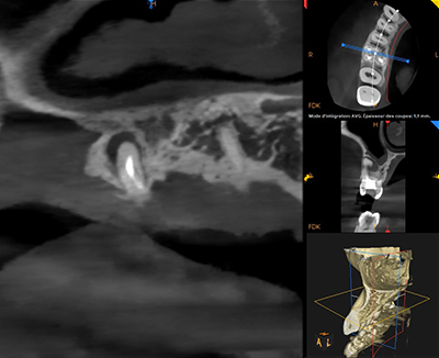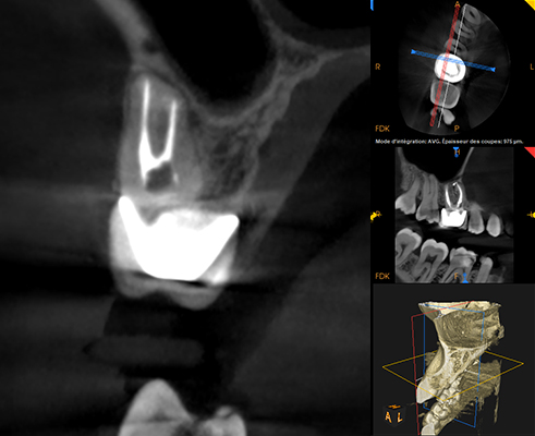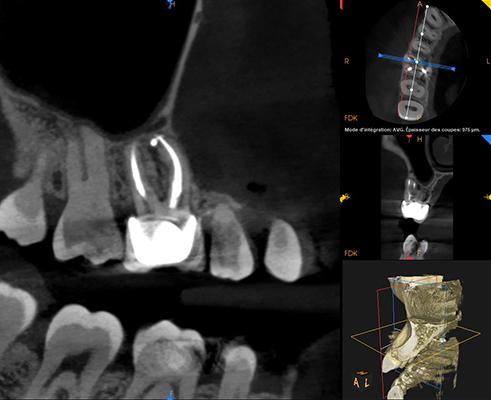 L’imagerie 2D montre des lésions apicales sur les racines palatine et mésio-vestibulaire de la 16 ainsi qu’une sous obturation des trois canaux. Un CBCT est réalisé afin de préciser l’anatomie canalaire et la taille des lésions apicales.