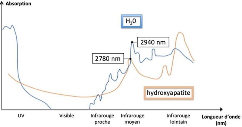 La spécificité du laser Erbium YAG par rapport à d’autres lasers utilisés en dentisterie, est sa longueur d’onde appartenant à la famille de l’infrarouge (moyen), mesurée à 2 940 nm. Sa forte absorption dans l’eau (98%) et les composants aqueux des tissus mous lui confère une place importante lors des thérapies de conservation de la vitalité pulpaire, de traitements endodontiques ou lors de la reprise de traitement par voies orthogrades et a rétro.