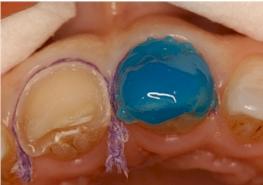 La préparation amélo-dentinaire, le collage et la dépose des excès de colle se font dent par dent, facette par facette : Mordançage de la préparation à l’aide d’un gel phosphorique à 37 % pendant 15 secondes, puis rinçage abondant et séchage léger afin de conserver une surface légèrement humide.